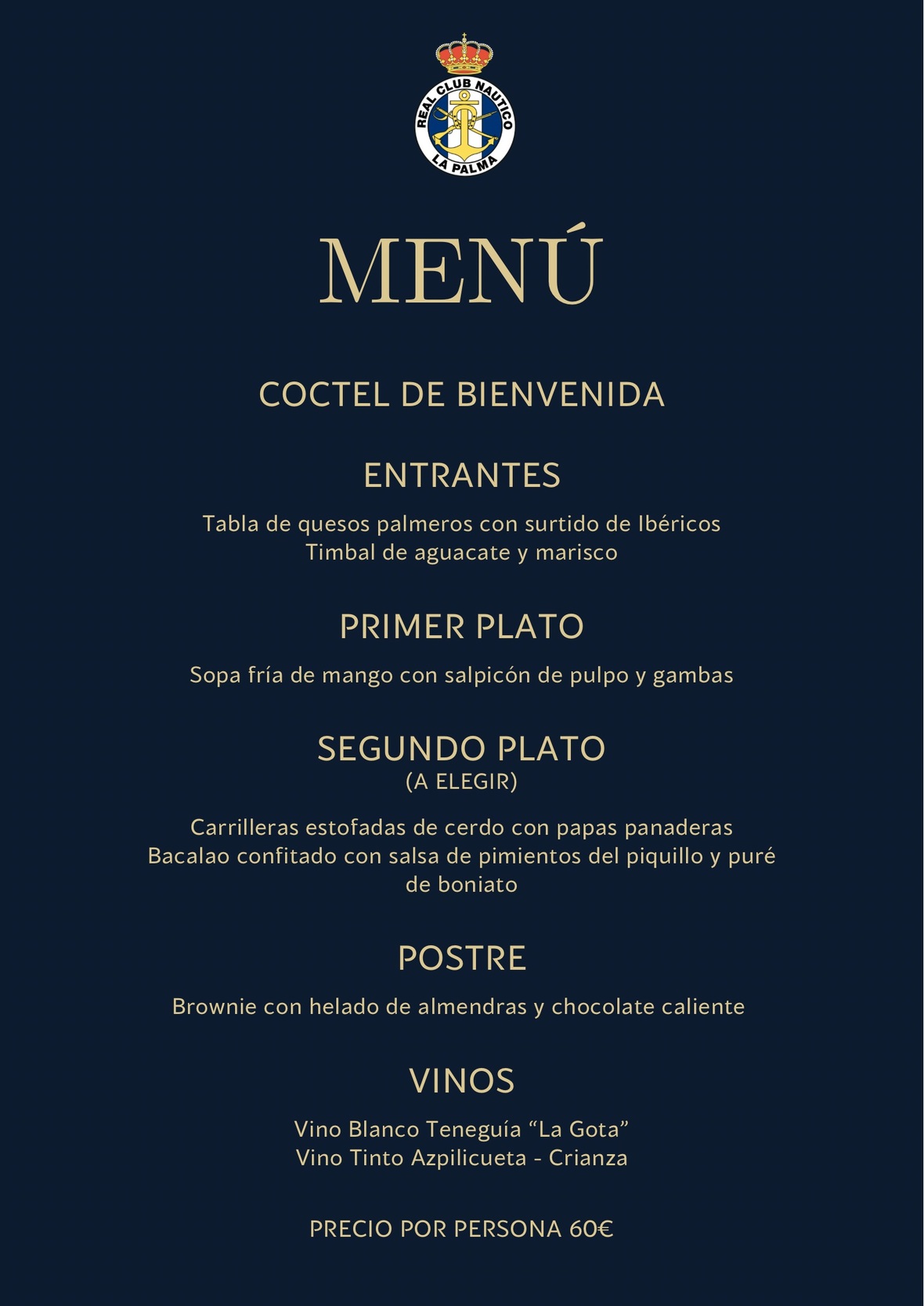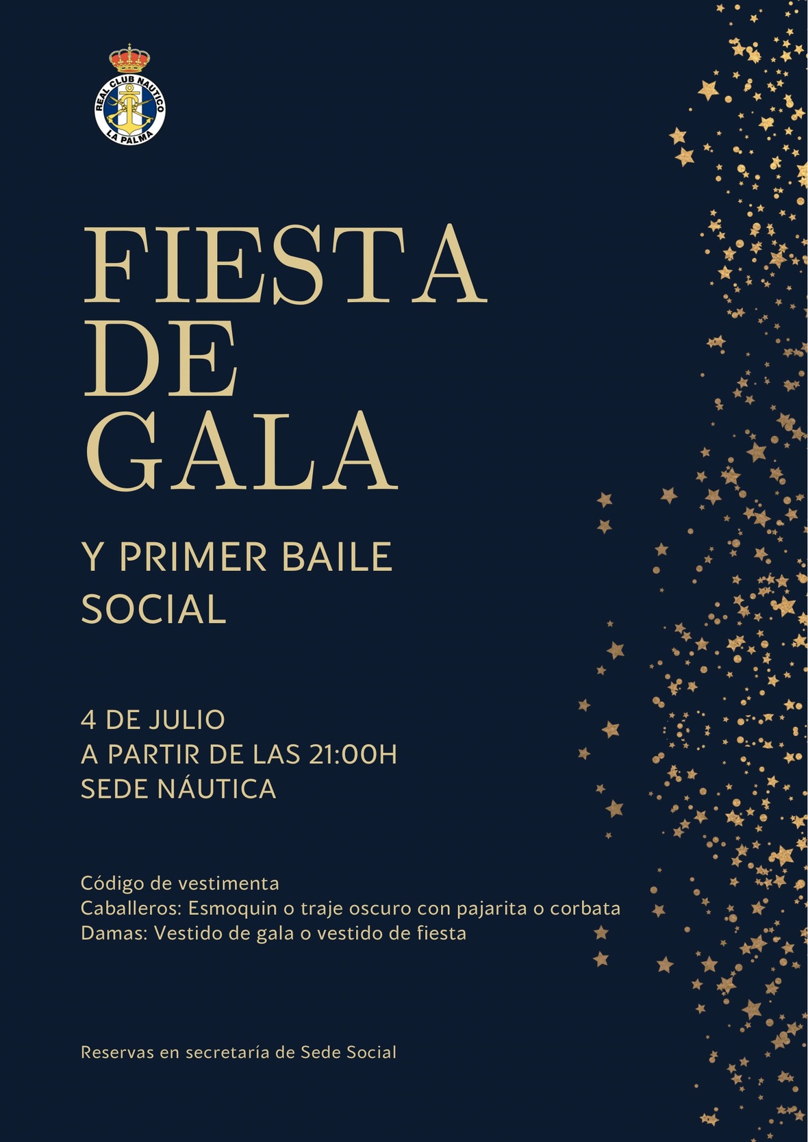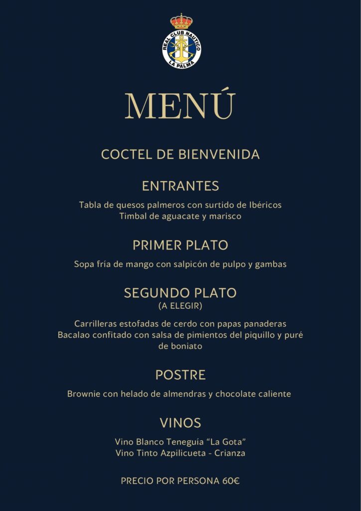 | Estimadas/os Socias/os: Conforme programación de actos de esta sociedad, con motivo de las Fiestas Lustrales de la Bajada de la Virgen de las Nieves 2025, les informamos que: El viernes 4 de julio, a partir de las 21:00 horas en la sede Náutica se celebrará la CENA Y BAILE DE GALA. Se adjunta menú. Código de vestimenta: Sres.: Esmoquin o traje oscuro con pajarita o corbata. Sras. : Vestido de gala, traje largo o de fiesta. Los jóvenes interesados en celebrar su primer baile social, se ruega procedan a inscribirse en secretaria de sede social del club en la C/A. Pérez de Brito, 9 o bien mediante email a rcnlapalma@gmail.com Reserva y retirada de tickets para la cena en secretaria de la sede social, a partir del viernes 20 de junio hasta llenar aforo. Mayor información al tfno. 922.41.19.35 |